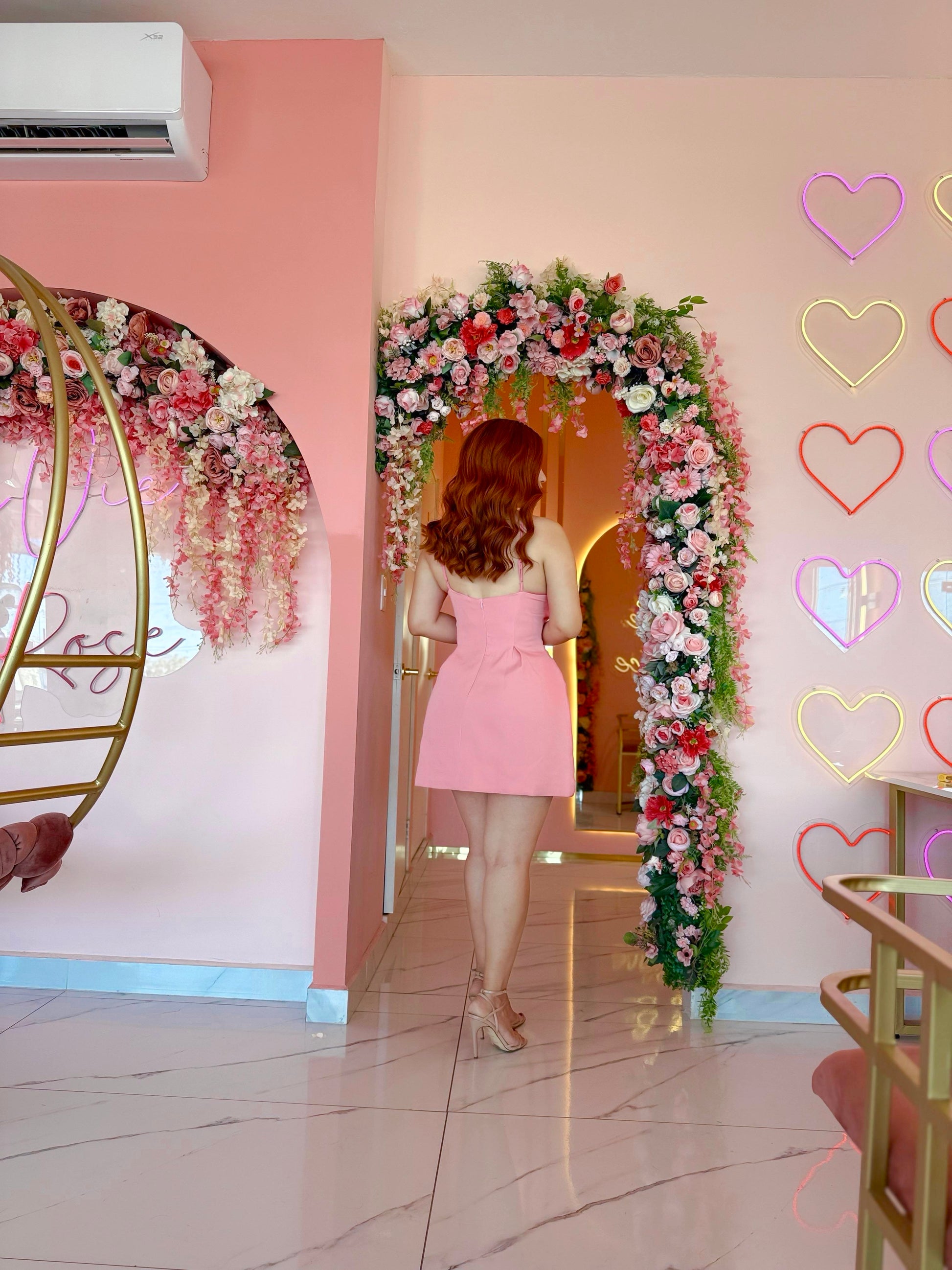 Vestido rosa corto con vuelo